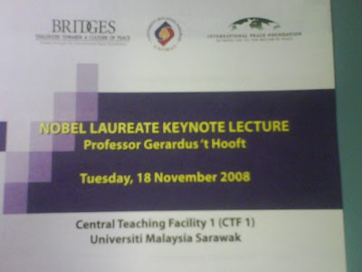 This is actually an event under the "BRIDGES- Dialogues Towards a Culture of Peace" series facilitated by the International Peace Foundation. It invites people from Thailand and Malaysia to participate events with the Nobel Laureates starting from Nov 2008 until April 2009. There will be a series of keynote speech and dialogues held in high schools and higher institutions, with researchers, students and academicians from both countries.